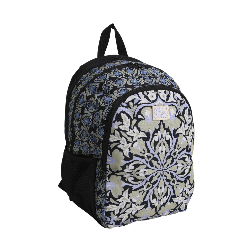 A backpack with three main zip compartments, including a padded laptop sleeve with an audio gusset for headphones, side mesh pockets, and a built-in stationery organiser. It features padded, adjustable shoulder straps and a reinforced padded back panel, with an all-over yardage print.