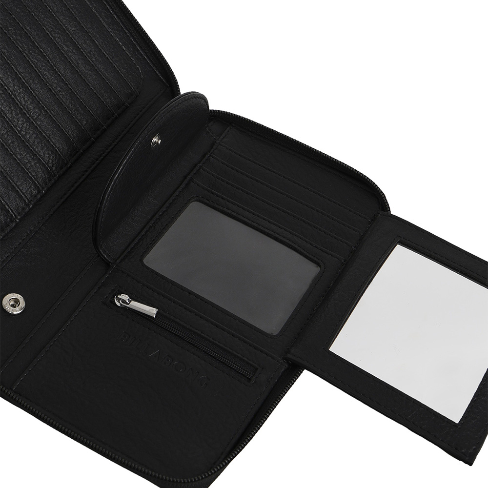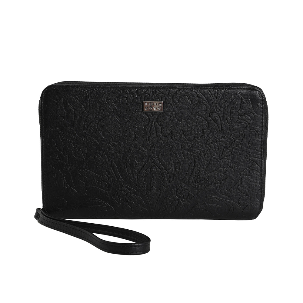 Large zip around travel wallet, Zip coin compartment, Multiple card sleeves, interior pocket sleeves, detachable wristlet, detachable interior pouch, Metal logo badge, Bandana inspired mandala embossed art
