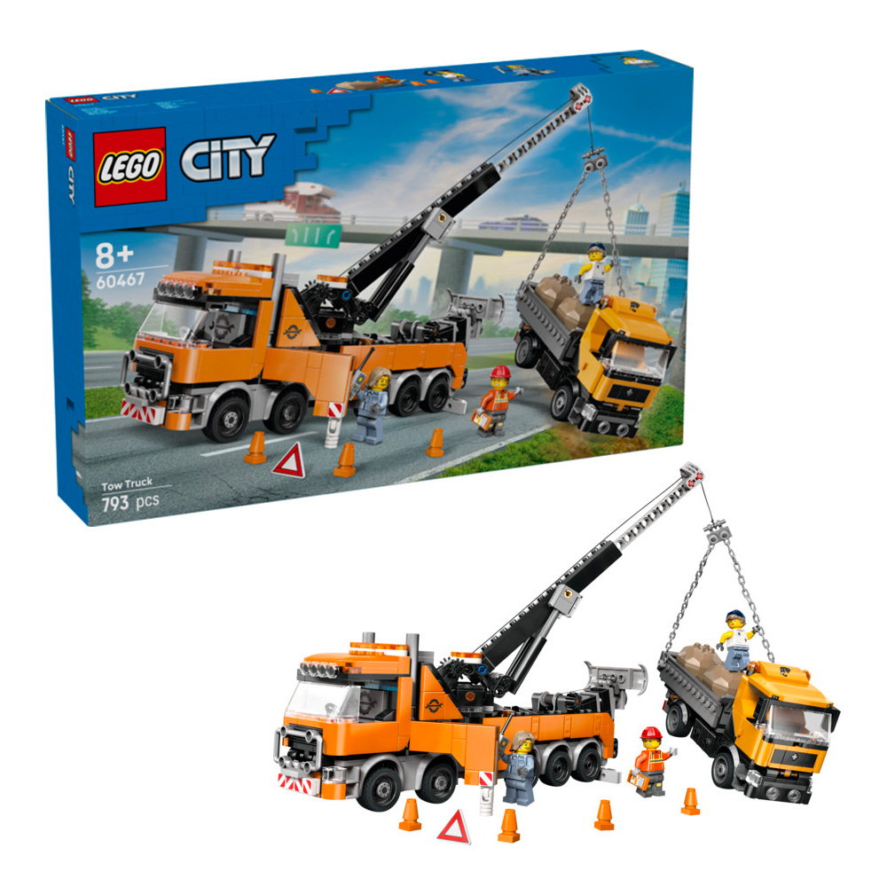 - WHATS IN THE BOX – Includes a rotator tow truck, dump truck, 2 boulders, restraining chain and 3 minifigures
