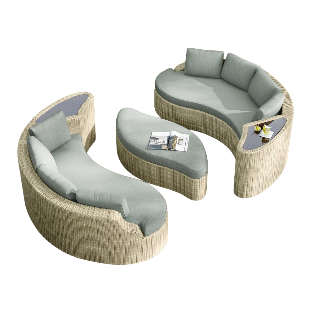 - Materials: Polyethylene resin wicker, water resistant Olefin fabric, powder coated aluminium, sponge