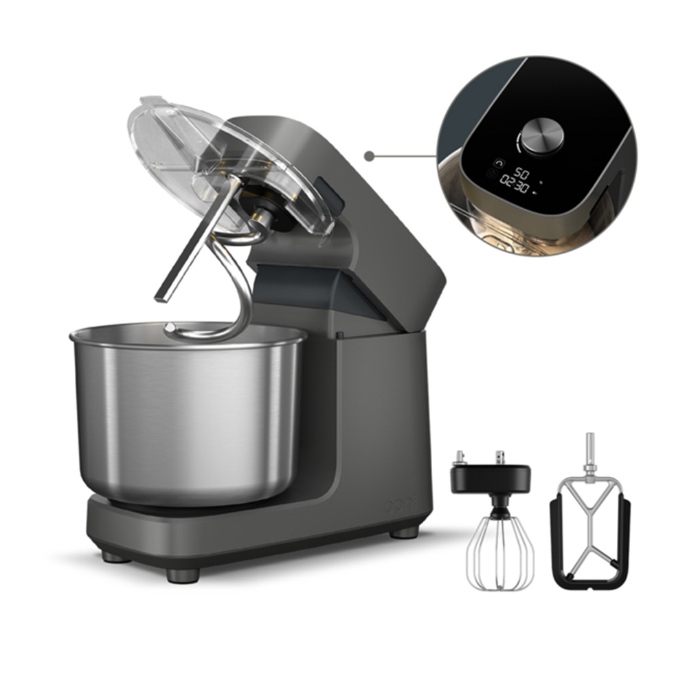 The Ooni Halo Pro Spiral Mixer is a revolution in mixing. It uses dual-kneading spiral mixing technology usually only found in professional kitchens. And, it’s small enough to fit neatly on a kitchen counter, so you can make bakery and pizzeria-quality dough at home.Spiral mixing technology helps to form a stronger gluten network, which delivers stronger dough, puffier crusts, plus better texture and taste. While the Ooni Halo Pro looks great, it’s still an essential kitchen tool, designed to be used every day. That’s why it has dependability built in – from its silicone feet to its stylish, anti-fingerprint glass-covered head. The Halo Pro’s intuitive control center lets you calibrate the settings to match a recipe precisely. And, with just a simple turn of the ergonomic dial, you’re up and running. Thanks to the high-capacity bowl and versatile attachments, Ooni Halo Pro really will help you to bake better at home – from pizza and bread to cakes, cookies and beyond.